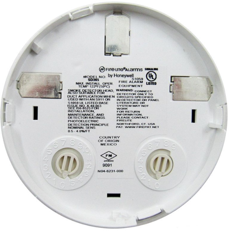 The Fire-Lite SD365 Series Addressable Photoelectric Smoke Detector is made exclusively for use with FireLite’s addressable fire alarm control panels. The SD365 Series point ID capability allows each detector’s address to be set with rotary, decimal address switches. Compatible with LiteSpeed protocol systems. Includes B300-6 mounting base and TR300 trim ring. COMPATIBLE BASES and ACCESSORIES: — B300-6: White, standard flanged low-profile mounting base — B501-WHITE: White, standard European flangeless mounting base — B200S-WH: White, Intelligent, programmable sounder base — B200SR-WH: White, Intelligent sounder base for retrofit applications — B200S-LF-WH: White, Low Frequency Intelligent, programmable sounder base — B200SR-LF-WH: White, Low Frequency Intelligent sounder base for retrofit applications — B224RB-WH: White, plug-in System Sensor relay base — B224BI-WH: White, plug-in System Sensor isolator detector base — TR300: White, replacement flange for B210LP or B300-6 bases — RA100Z(A): Remote 3–32VDC LED annunciator, mounts to a U.S. single-gang electrical box, for use with B501 and B300-6 bases.