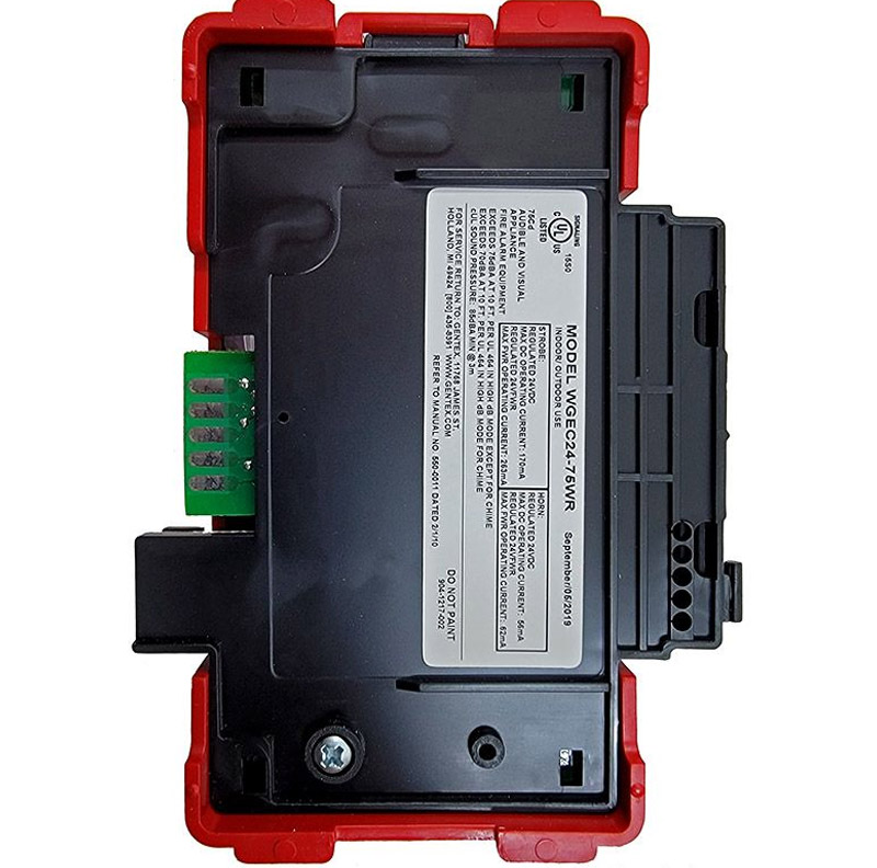 The Gentex WGEC24-75WR is a weatherproof horn / strobe from the Outdoor Commander Series. This model features a plain red faceplate with no lettering. — 75 Candela Strobe — 24VDC applications. — Includes mounting plate for wall mounting