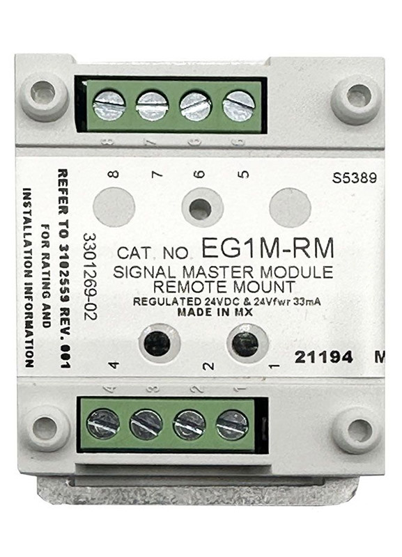 The Kidde EG1M-RM Genesis Signal Master Synchronization Remote Mount Module delivers independent horn control for horn-strobes over two wire Genesis circuits. Two methods of horn control available: traditional NAC signal silence or normally-closed contact. Compatible for use with Genesis, enhanced Integrity 2400 Series products, and EBPS Remote Booster Power Supplies.