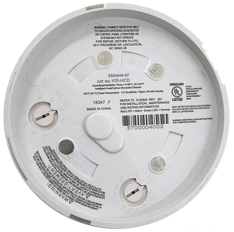The Kidde KIR-HCD Intelligent Multisensor Heat and CO Detector analyzes heat sensor independently from the CO sensor to determine whether to initiate a fire alarm, a life safety CO alarm, or both. Features rotary addressing. COMPATIBLE BASES and ACCESSORIES: — KI-SB Detector Mounting Base – Standard — KI-SB4 4-inch Detector Mounting Base c/w Trim Skirt — KI-RB Detector Mounting Base w/Relay — KI-RB4 4-inch Detector Mounting Base w/Relay, c/w Trim Skirt — KI-IB Detector Mounting Base w/Fault Isolator — KI-IB4 4-inch Detector Mounting Base w/ Fault Isolator, c/w Trim Skirt — GSA-LED Remote Alarm LED (not for EN54 applications) — KI-ABLT Low Frequency Audible (Sounder) Base for CO and Fire Detectors — KI-ABDT Audible (Sounder) Base for CO and Fire Detectors — GSA-LED Remote Alarm LED (not for EN54 applications) — FX-T3T4 Tone Generator for Detector Sounder Bases with CO mode — GSA-TS4 Trim Skirt (supplied with 4-inch bases)