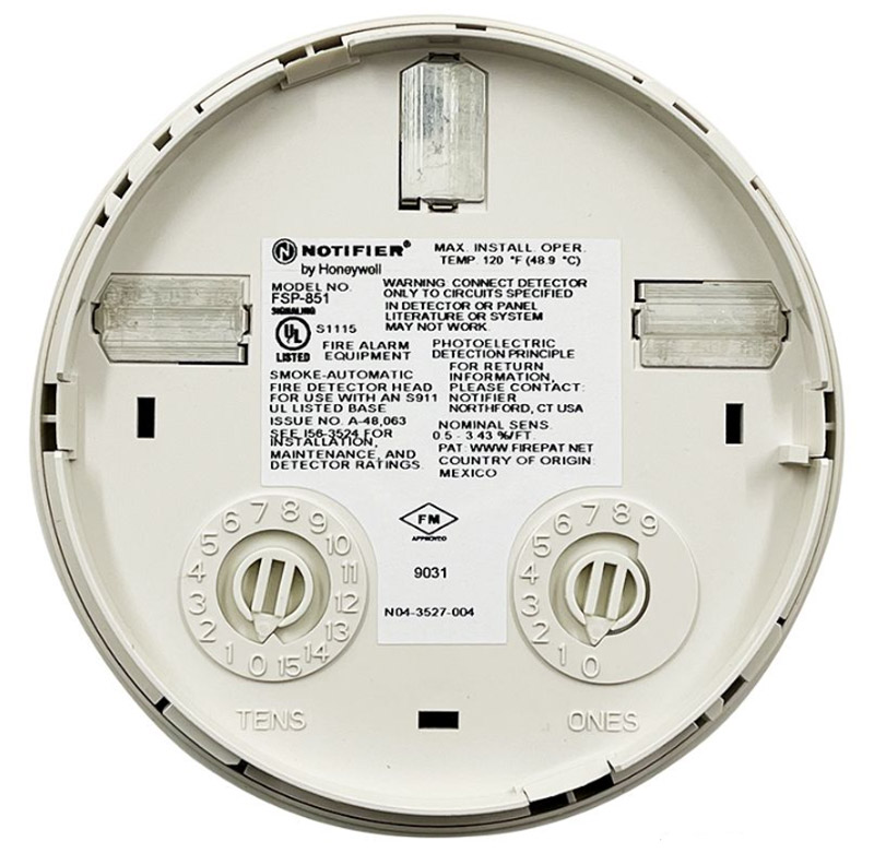The Notifier FSP-851 Smoke Detector is a replacement photoelectric smoke detector head compatible for use with Notifier Intelligent Fire Alarm Control Panels. Notifier 851 Series smoke detectors can be used to replace the 751 Series plug-in detectors for legacy applications. COMPATIBLE INTELLIGENT BASES: — B210LP Standard U.S. flanged low-profile mounting base. — B710LP Standard replacement flanged low-profile mounting base. — B501 Standard European flangeless mounting base. — B200S Intelligent, programmable sounder base — B200SR Intelligent sounder base – Replaces B501BH series bases in retrofit applications. — B224RB Plug-in System Sensor relay base. — B224BI Plug-in System Sensor isolator detector base. NOTE: All base types require an electrical backbox which is at least 1.5″ (3.81 cm) deep. NOTE: A version of this item for use in Canada is available.