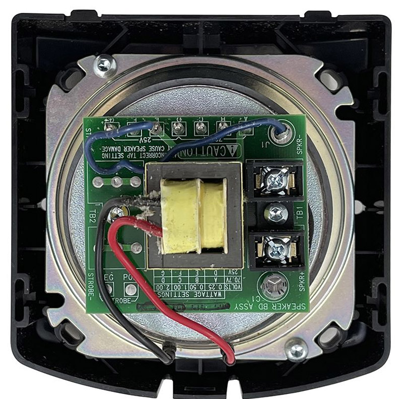 The Simplex 4902-9717 TrueAlert Wall Mount Fire Alarm Speaker (White) is a multi-application audible alert appliance. — Multi-tapped design provides output power of 1/4, 1/2, 1, or 2 W with either 25 or 70.7 VRMS input — In/out wiring terminals for 18 AWG to 12 AWG — Capacitor input for connection to supervised notification appliance circuits — Dimensions: 5 1/8” H x 5” W x 1 1/2” D (130 mm x 127 mm x 38 mm) Mounts to 4” square outlet box, 1 1/2” deep with 1 1/2” deep box extension