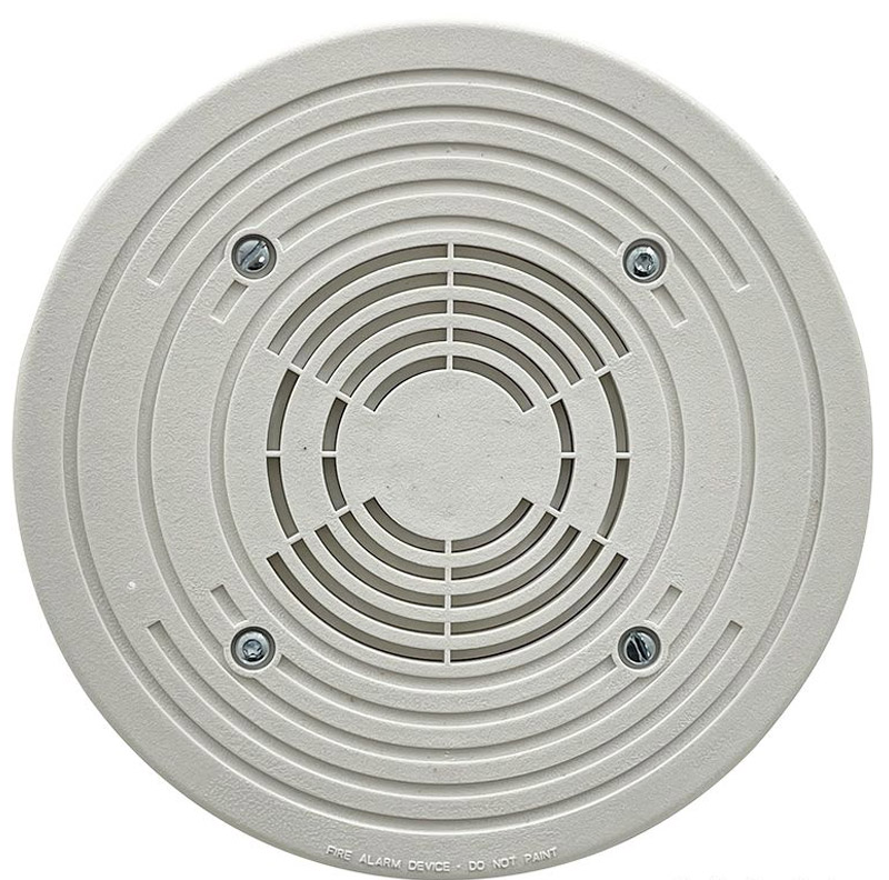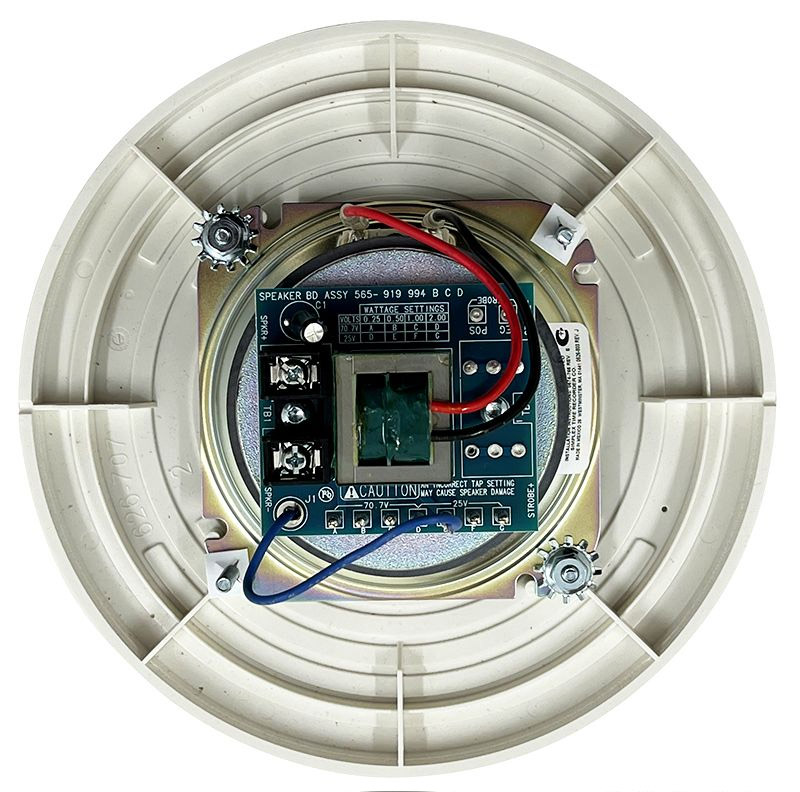 Simplex 4902-9721 is a round White Speaker is suitable for ceiling or wall mounting. The multi-tapped speaker transformer accommodates either 25 or 70.7 VRMS and provides an output of/from 1/4 to 2W. OPTIONAL MOUNTING ACCESSORIES — 4905-9999 Red wire guard with mounting plate; compatible with semi-flush or surface mounted boxes; for use with 4” square electrical box mounting hole patterns only. — 2905-9946 Tile bridge 7 ½” Diameter x ½” D (191 mm x 13 mm)