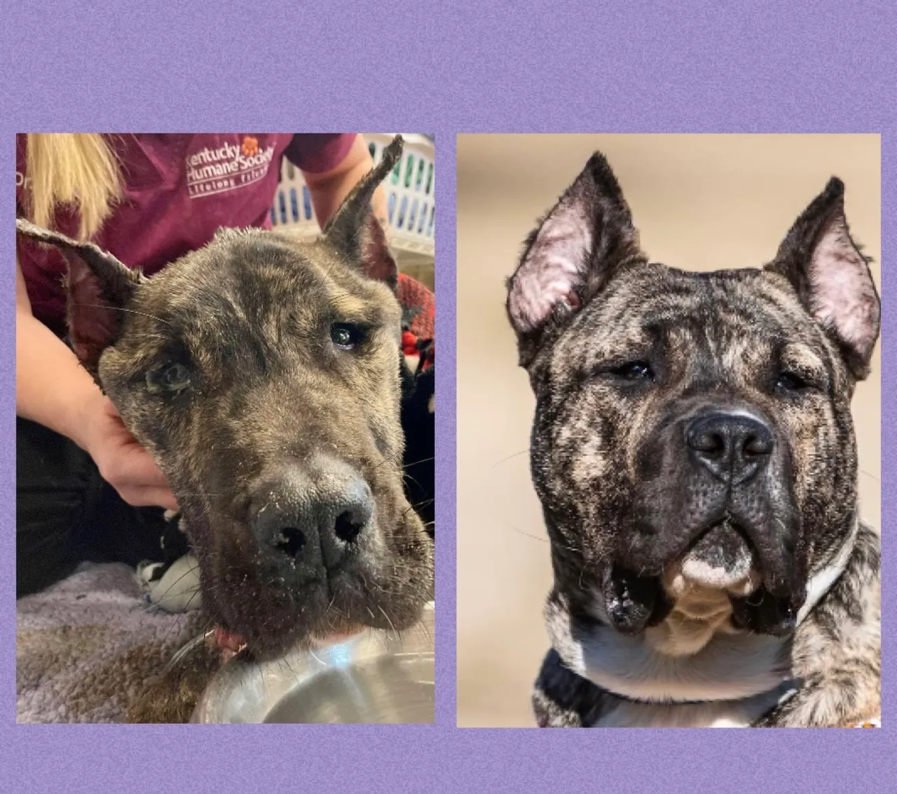 Ethan’s story was minutes away from ending, way too soon. He was freezing to death in the parking lot at the Kentucky Humane Society. His body was shutting down, his organs were on the verge of no longer functioning. It’s easy to imagine that he no longer believed anyone cared. It had been weeks or months since he had eaten a meal. Small amounts of water somehow found his tongue. He weighed 38 pounds. Devastating, when you realize he should weigh 90 pounds. Somehow, a passing car, filled with generous people who had just donated some items at KHS, saw some movement from under a dirty blanket. They stopped, called the KHS number and a couple employees came rushing out to bring this dog inside. Not knowing if he had any chance of survival they rushed him in to the KHS vet services area where the vet team took immediate action to save his life. His temperature was too low to register any number at all and it took the smallest iv catheter needle because he was so dehydrated his veins had become tiny. He received warming blankets, fluids, and a partial bath before resting and going home with Jaci, one of the vet techs caring for him. He had to be rushed  to the ER in the middle of the night because of his worsening condition. From there, he needed special fluids and constant monitoring. He came back to KHS a few days later and took a whole day to sleep and recover. Still unable to walk, Dr Bewley, the vet, and Angela Mikesell, the vet tech came in that night to care for Ethan. He began to take steps that very night. The next day I came by to visit Ethan and to see how he was doing. He came over to the gate and licked me in the face and I knew then I would do anything for Ethan. I began volunteering that night to come in and take care of him. I would change his dressings on his legs, clean up his sleeping area and change his blankets and bedding. I would feed him and give him medicine then take him out for a walk. Usually I would take him on a couple walks a night. Before and after he would eat. I tried to come in each morning to also check up on him. About 10 days later bad weather was coming in and we weren’t sure whether anyone would be able to come in and care for him. So it was decided that I would take him home that night and bring him back during the day, as long as the weather wasn’t bad. From that day forward he stayed at my house at night. The vet team monitored Ethan during the day and then I would stop by there in the afternoon to pick him up and bring him back home. By this point everyone in our house (including the animals) were in love with Ethan and it seemed like the best possible situation for him. As Ethan continued to get better and his neuter surgery approached, an adoption celebration was planned. On March 10, 2021 we officially adopted Ethan and he became an official member of our family.