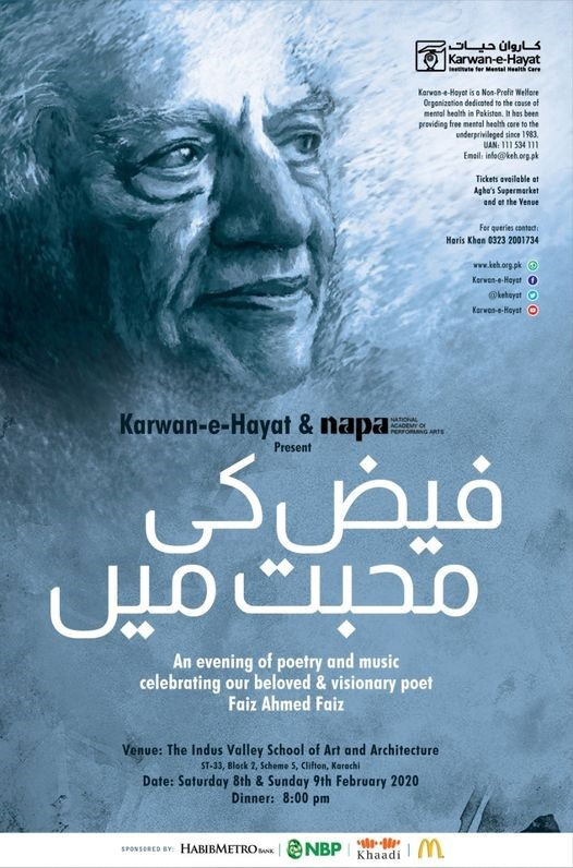 Karwan-e-Hayat in association with NAPA presents 2020 fundraiser event, on 8th and 9th February 2020 *Faiz ki Mohabbat Mein*, an evenin...